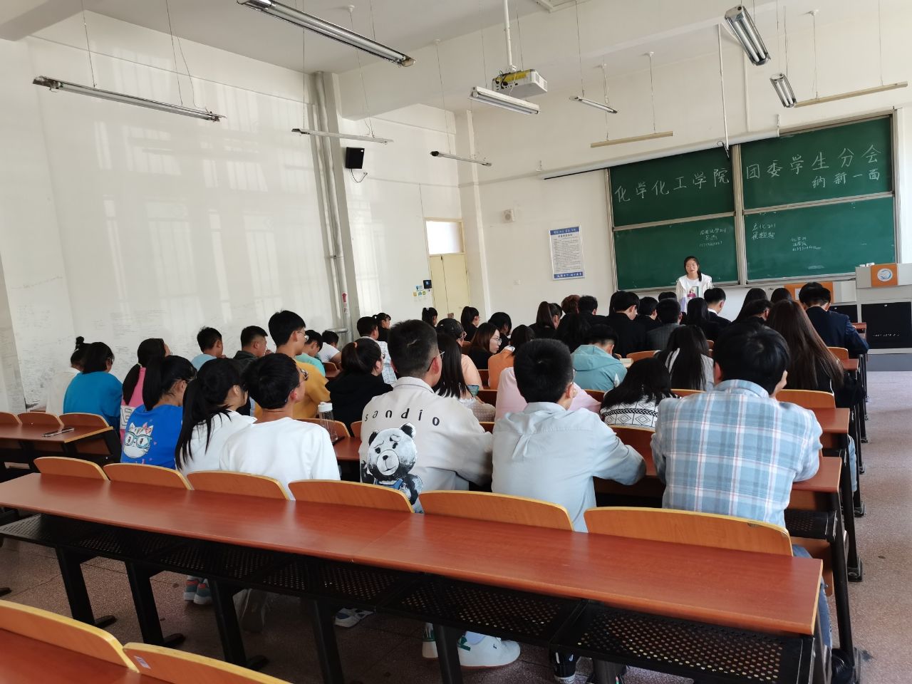 活动伴随着主持人的精彩讲说拉开序幕。首先每一位面试者依次上台在黑板上写出自己的班级、姓名和联系方式,再进行自我介绍并说明自己的意向部门1和意向部门2。与此同时,各位面试官也对他们提出一些相应的问题,以便对他们加入意向部门的理由等有所了解。整个会场中气氛活跃、井然有序,所有面试成员认真的思考面试官提出的问题并以最简洁清晰的语句回答这些问题。此外,面试官也通过举个别例子的形式让面试者们设身处地的思考,当遇到各种比较棘手的情况时该如何处理,这也是对他们的一种考验。最后活动在主持人的总结中落下帷幕。