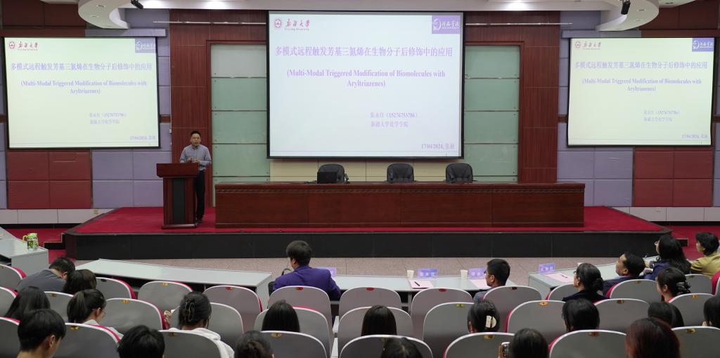 张永红教授做了题为《多模式远程触发芳基三氮烯在生物分子后修饰中的应用》的报告。详细介绍了其研究团队在生物分子后修饰领域的研究进展,以及多模式远程触发芳基三氮烯在这一领域的应用。张教授深入浅出的讲解让在座师生对这一领域有了更深的理解。